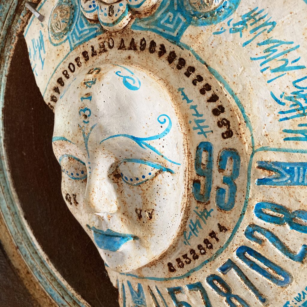 Die Skulptur verwischt die Grenzen zwischen Vergangenheit, Gegenwart und Zukunft. Sie besteht aus Gips und ist auf einer Holzplatte montiert, auf der mysteriöse konzentrische Kreise eingearbeitet sind.
